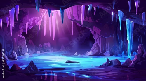 Mystery landscape of a cave with glowing stalactites and a hidden underground lake, solid color, illustration template