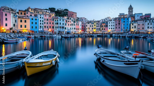 Mystic landscape of the harbor with colorful houses and the boats in Porto Venero, Italy, Liguria