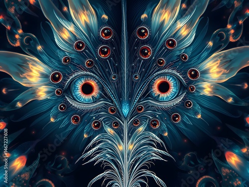Mystical Abstract Art Blue Eye with Orange Accents and Intricate Feather Design