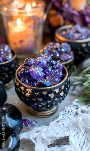 Mystical arrangement with purple crystals in ornate black and gold bowl, glowing candles, and delicate lace. Atmospheric spiritual wellness setting for meditation and healing.