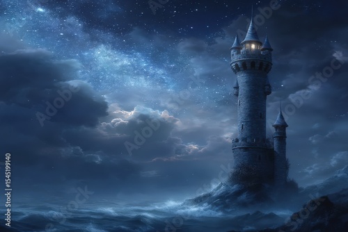 Mystical castle tower standing against a starry night sky with rolling ocean waves