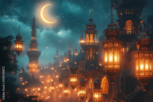 Mystical Cityscape with Glowing Lanterns Under a Crescent Moon and Starry Sky