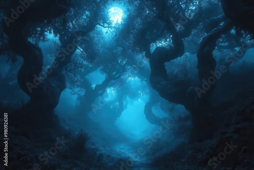 mystical enchanted forest twisted ancient trees bioluminescent flora eerie fog moonlit clearings fantasy atmosphere