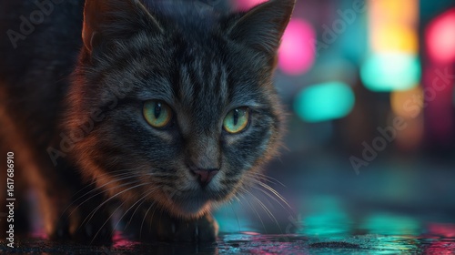 Mystical Feline Gaze: A captivating close-up of a sleek, gray tabby cat with striking green eyes, peering into the mesmerizing reflections of a vibrant neon-lit city street.