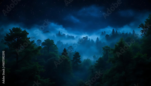 Mystical Foggy Forest at Night with Starry Sky Landscape Photography