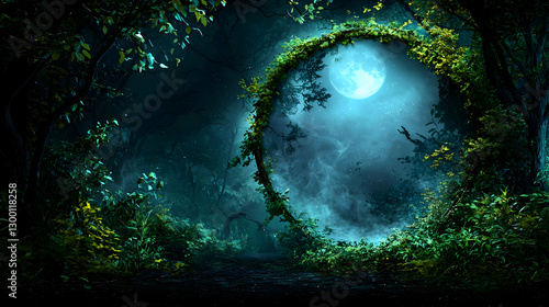 Mystical Forest at Night with a Glowing Moon and Circular Foliage Frame