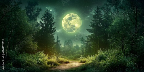 Mystical Forest Illuminated by Glowing Green Moon Creating Enchanting Serene Night Atmosphere