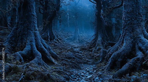 Mystical Forest Path Blue Fog Dark Trees Roots