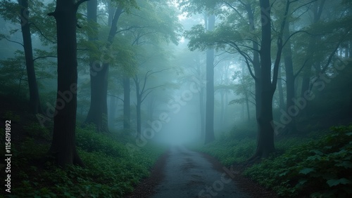 Mystical Forest Path: Foggy Road Through Enchanted Woods