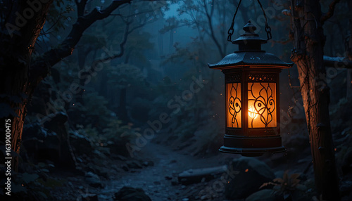 Mystical forest path illuminated by an antique lantern glowing warmly on a misty evening.