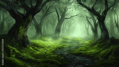 mystical forest scene with dense trees, mist, and vibrant green foliage, creating enchanting atmosphere. path leads through serene landscape