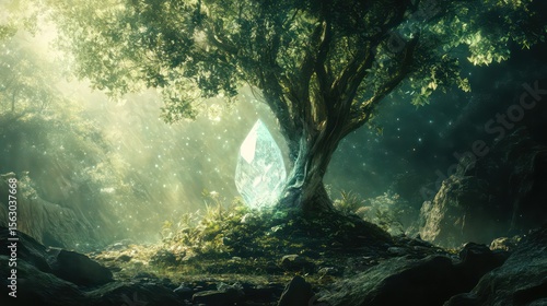 Mystical Forest Scene with Glowing Crystal and Ancient Tree in Dreamy Light