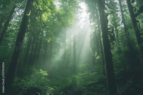 Mystical Forest Sunlight: Lush Green Canopy and Tranquil Ambiance