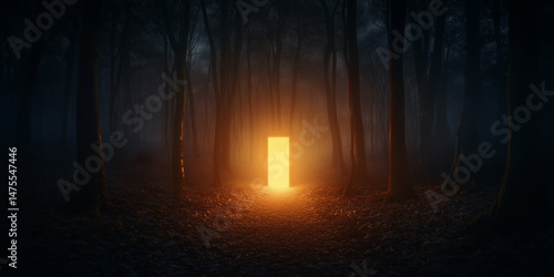 Mystical Glowing Door in a Shadowy Forest at Night