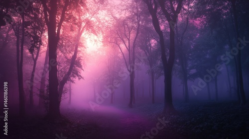 Mystical, glowing path through a misty, purple forest.