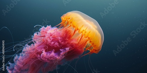 Mystical jellyfish drifting in twilight ocean waters with luminous orange and pink hues, creating an ethereal underwater ambiance.