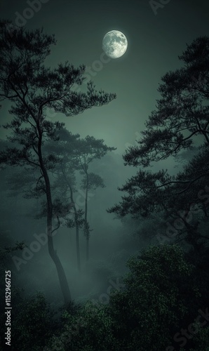 Mystical moonlit forest scene at night, shrouded in fog, with tall pine trees.