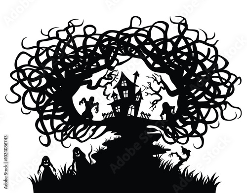 Mystical nightfall silhouetted trees and spooky manor vector EPS template