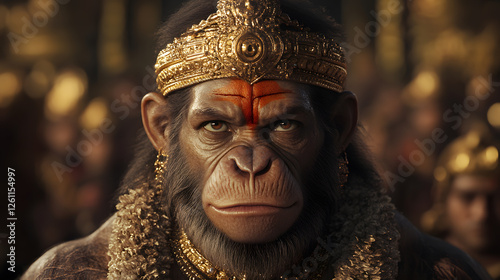 Mystical primate adorned in golden finery, gazing intently with solemn eyes. A portrait of reverence and power. Intricate details and golden accents abound.