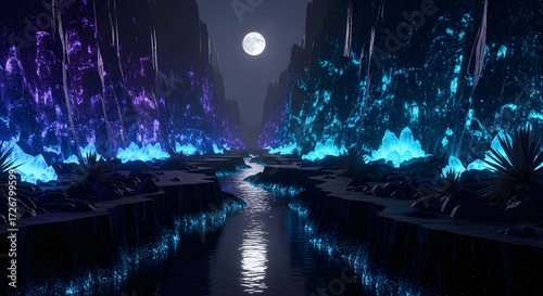 Mystical river flows through glowing crystal caves under the moonlight, Moonlit Crystal Canyon Fantasy Landscape