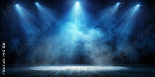 Mystical Stage with Blue Spotlights, Wooden Floor, Smoke, Dark Background, stage ,spotlight, background