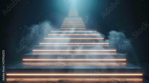 mystical staircase illuminated by glowing lights leads into foggy atmosphere, creating ethereal and dreamlike scene