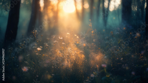 Mystical summer forest with golden sunset light and wildflowers, seasonal landscape