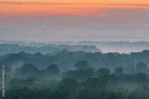 Mystical view from top on forest under haze at early morning. Mist among layers from tree silhouettes in taiga under warm predawn sky. Morning atmospheric minimalistic landscape of majestic nature.