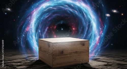 Mystical Wooden Box on an Alien Planet with Nebula Background Backdrop