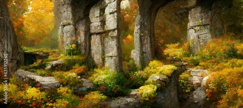 Mystical woodland forest in Autumn with remnants of old druid buildings in ruin. Enchanted magic forest, ancient trees, colorful flowers, peaceful dreamy fairytale fantasy wonderland, generative ai