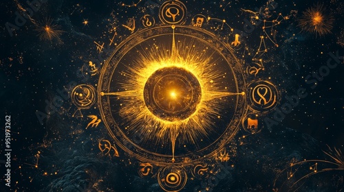 Mystical Zodiac Poster with Golden Sun and Zodiac Symbols