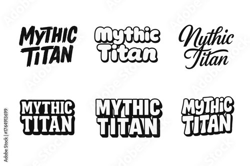 Mythic Titan Styles. Mythic Titan. Set lettering. harmonious lettering variations of the same emblematic concept (Grunge textured brush lettering, Rounded