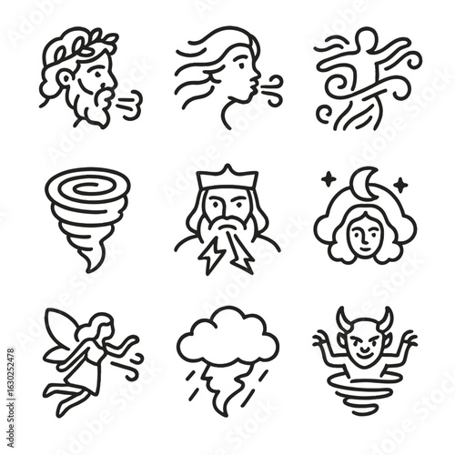 Mythical Wind Figures Icons. Outline icon set of mythical wind figures: Zephyr god, Wind spirit, Air elemental, Whirlwind, Storm