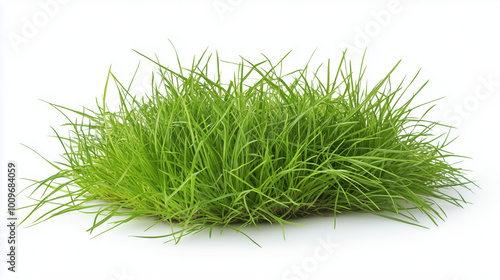 Na białym tle widać gęstą, soczystą zieleń wiosennej trawy, która zdaje się być pokryta kroplami rosy.