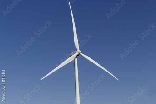 Nacelle and blades of windmill on blue sky