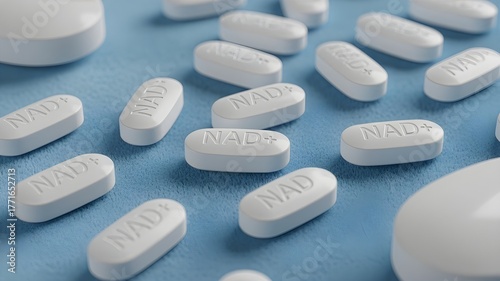 NAD+ Longevity Supplements: White Tablets on Blue Background