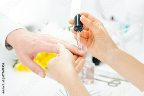 Nagelpflegerin tropft Öl auf die Fingernägel einer Kundin nach der Maniküre