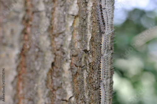 Nahaufnahme einer Prozession von Eichenprozessionsspinner Raupen