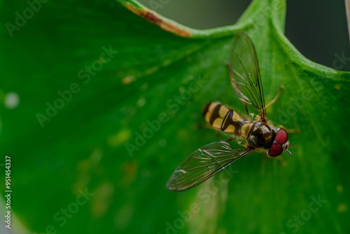 Nahaufnahme einer Schwebfliege mit roten Augen auf einem Ginkgo-Blatt