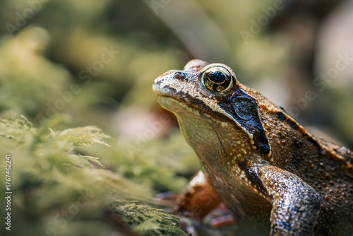 Nahaufnahme eines braungrünen Frosches auf moosbedecktem Untergrund im natürlichen Lebensraum