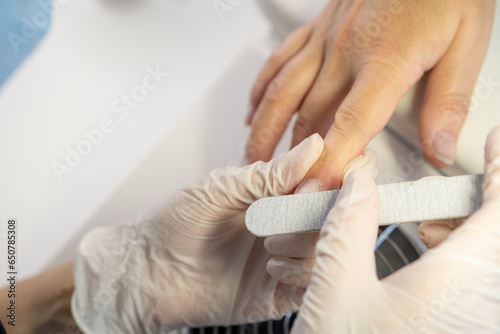 Nail care procedure in a beauty salon. Female hands and tools for manicure, process of performing manicure in beauty salon. Gloved hands of a skilled manicurist cutting cuticles. Concept spa body care