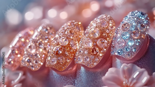 Nails adorned with Swarovski crystals forming elegant floral designs, different sizes of crystals adding depth and texture, glossy surface reflecting soft light, captured in a detailed close-up view,