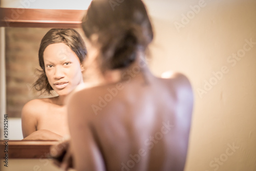 naked girl making up in front of the mirror in the bathroom