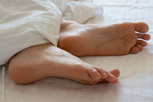 Naked male feet on bed appear out of blanket close up. A man sleeps on a white sheet covered with a white blanket