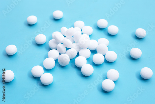 Naphthalene mothballs on blue backgrond.