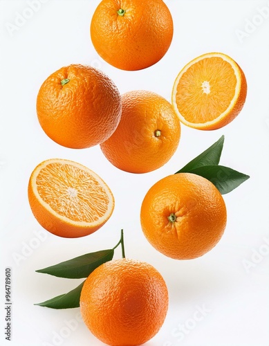 Naranjas cayendo, con un fondo blanco.