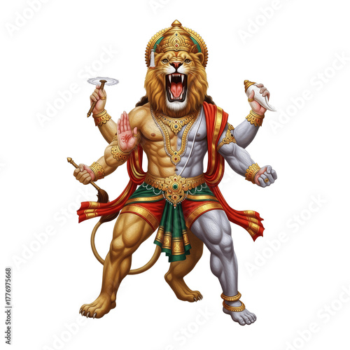 Narasimha, half lion half human Vishnu avatar in roaring powerful pose, divine Hindu god art, white background, Narasimha dev kala, नरसिंह देव कला