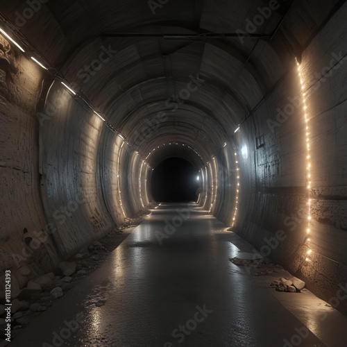 Narrow and twisted tunnel with a bright, sparkling light at the end, shimmering light, radiant ambiance