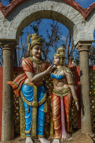 Narrow view of an ancient colorful sculpture of a men, seen talking with a women, Chennai, Tamil nadu, India, Jan 29 2017