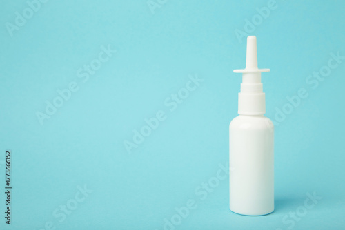 Nasal drops medicine bottle on blue background. Space for text